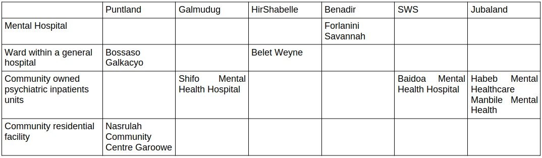 Psychiatrie: Für 16,8 Millionen Einwohner gibt es in ganz Somalia (inkl. Somaliland) nur 82 professionelle Kräfte im Bereich psychischer Gesundheit, nur vier davon sind Psychiater (UNSOM 24.8.2022). In Süd-/Zentralsomalia und Puntland gibt es nur einen Psychiater, elf Sozialarbeiter für psychische Gesundheit sowie 19 Pflegekräfte. Folgende psychiatrische Einrichtungen sind bekannt (WHO Rizwan 8.10.2020):