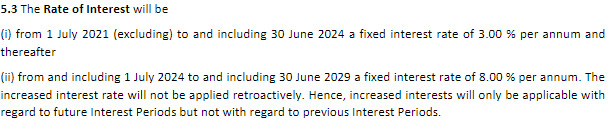 „Der Zinssatz beträgt drei Prozent per annum am Beginn der Laufzeit (vom 15.4.2021 bis 14.4.2024) und wird nach den ersten drei Jahren auf acht Prozent per annum erhöht (vom 15.4.2024 – 14.4.2029).“
