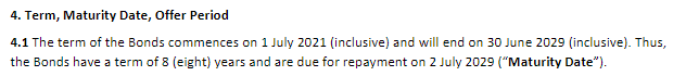 Im Prospekt des Bonds 2021 werden hingegen die Zinszahlungszeiträume „1.7.2021 – 30.6.2024“ bzw „1.7.2024 – 30.6.2029“ (siehe Beilage ./2, Seite 85, Punkt 5.3.) genannt. Als Fälligkeitstag der Anleihe wird der „2.7.2029“ angegeben (Beilage ./2, Seite 84, Punkt 4.1.).