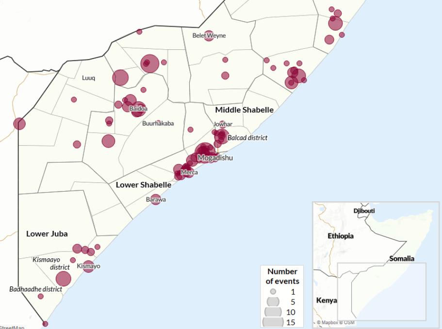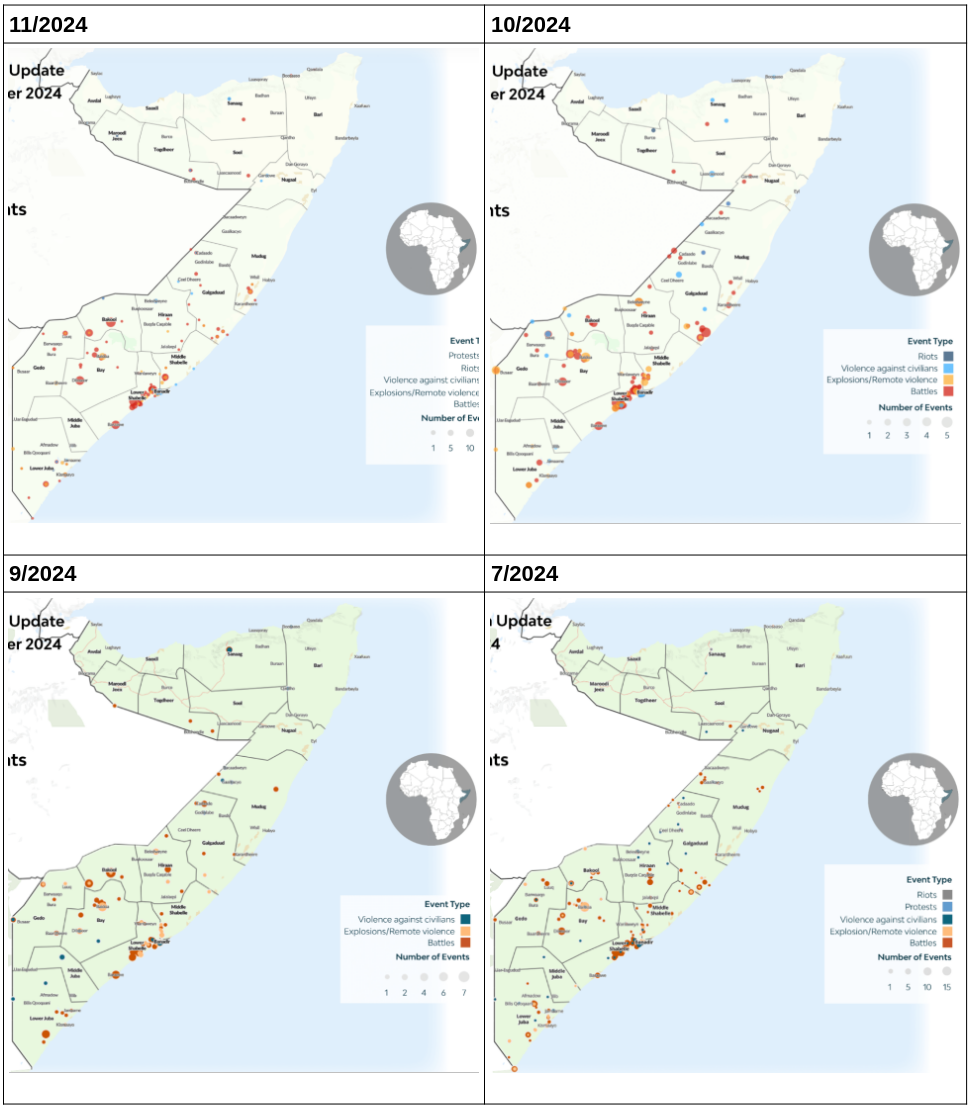ACLED bietet einen Überblick über die Vorfälle in Somalia innerhalb vier unterschiedlicher Monate des Jahres 2024: