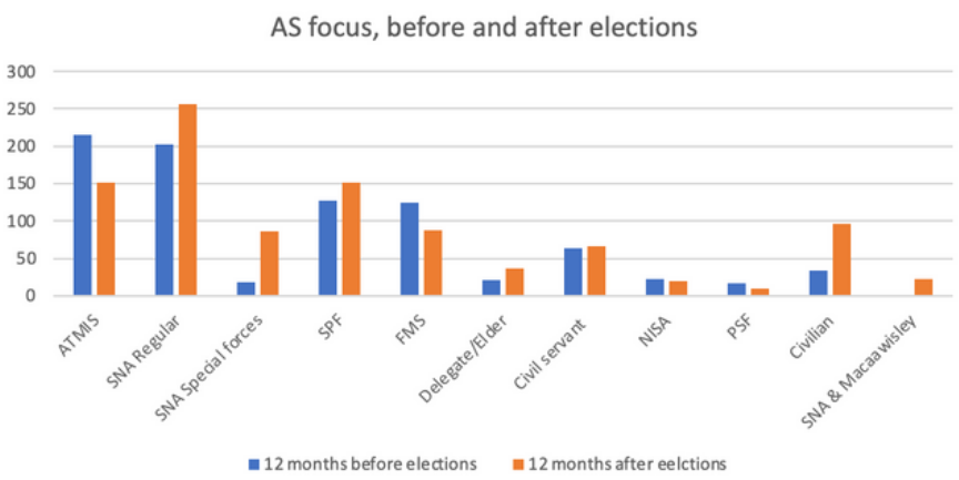 Armee und Schutztruppe (ATMIS) als relevanter Faktor: ATMIS wurde im Juni 2023 um 2.000 Mann reduziert, im Dezember 2023 um 3.000 Mann und im Juni 2024 um weitere 2.000. Die Ausbildung neuer Soldaten für die Bundesarmee machte 2023 gute Fortschritte, es mussten aber auch hohe Verluste hingenommen werden. Das größte Problem ist neben der Truppenstärke die fehlende Ausrüstung (schwere Waffen, Luftkomponente etc.). Eine Nachfolgemission für ATMIS steht im Raum (BMLV 7.8.2024). [siehe auch Ausländische Kräfte]