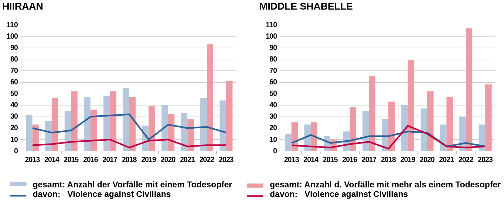 Spannungen in neu eroberten Gebieten haben zudem teils zu Kampfhandlungen zwischen Clans geführt (AQ21 11.2023). Der Konkurrenzkampf zwischen den Clans um die Kontrolle über befreite Gebiete in Teilen von HirShabelle löste wochenlange angespannte Auseinandersetzungen und in einigen Fällen tödliche Zusammenstöße aus (Sahan/SWT 9.8.2023).