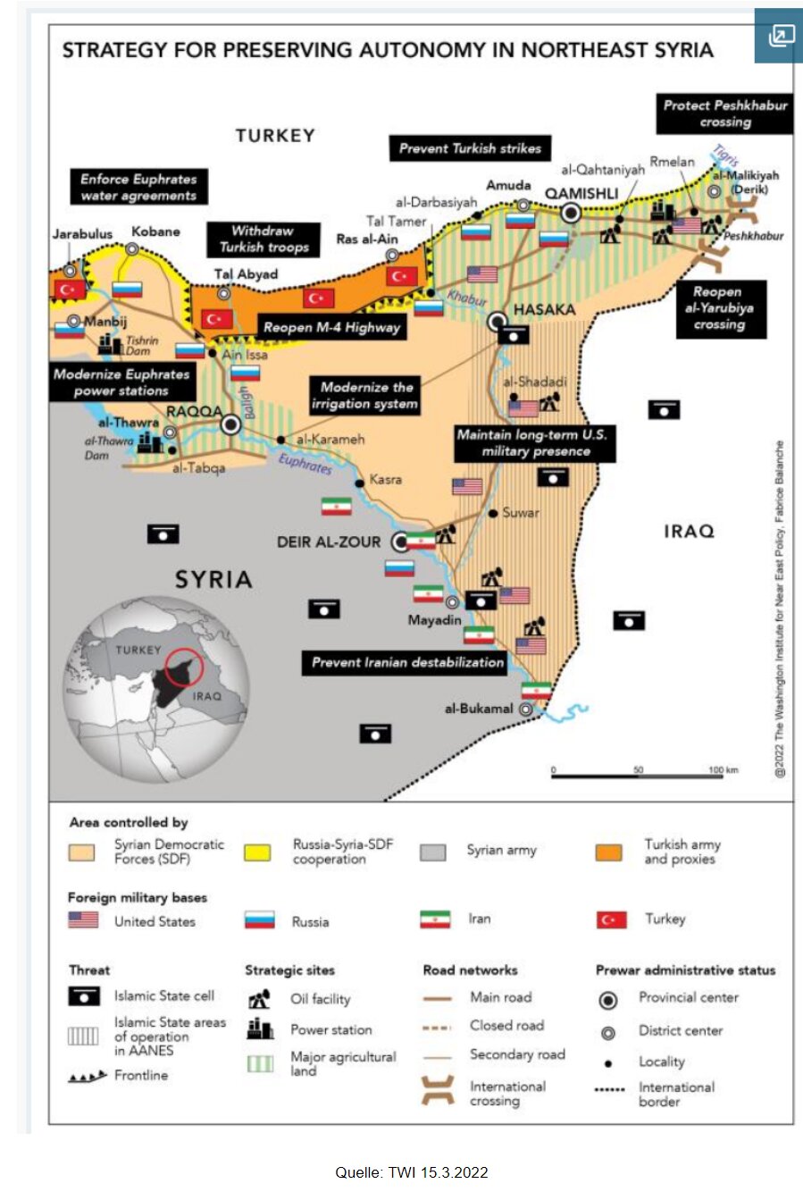 Die Entscheidung Moskaus, 2015 in Syrien militärisch zu intervenieren, hat das Assad-Regime in Damaskus effektiv geschützt. Russische Luftstreitkräfte und nachrichtendienstliche Unterstützung sowie von Iran unterstützte Milizen vor Ort ermöglichten es dem Regime, die Opposition zu schlagen und seine Kontrolle über große Teile Syriens brutal wiederherzustellen. Seit März 2020 scheint der Konflikt in eine neue Patt-Phase einzutreten, in der drei unterschiedliche Gebiete mit statischen Frontlinien abgegrenzt wurden (IPS 20.5.2022). Das Assad-Regime kontrolliert rund 70 % des syrischen Territoriums. Seit dem Höhepunkt des Konflikts, als das Regime - unterstützt von Russland und Iran - unterschiedslose, groß angelegte Offensiven startete, um Gebiete zurückzuerobern, hat die Gewalt deutlich abgenommen. Auch wenn die Gewalt zurückgegangen ist, kommt es entlang der Konfliktlinien im Nordwesten und Nordosten Syriens weiterhin zu kleineren Scharmützeln. Im Großen und Ganzen hat sich der syrische Bürgerkrieg zu einem internationalisierten Konflikt entwickelt, in dem fünf ausländische Streitkräfte - Russland, Iran, die Türkei, Israel und die Vereinigten Staaten - im syrischen Kampfgebiet tätig sind und Überreste des Islamischen Staates (IS) regelmäßig Angriffe durchführen (USIP 14.3.2023).