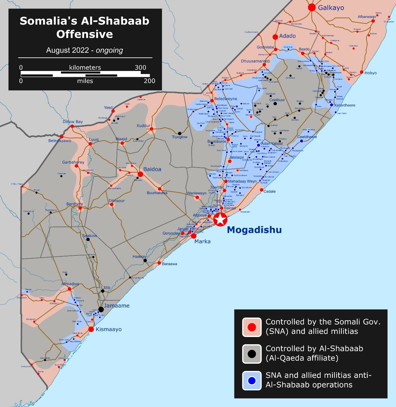 Al Shabaab kontrolliert den Ort Leego an der Straße zwischen Wanla Weyne und Buur Hakaba (BMLV 9.2.2023). Damit ist die Route von Mogadischu nach Baidoa für Zwecke der Regierung geschlossen; diese gilt auch für die Hauptversorgungsroute nach Baraawe (Bryden 8.11.2021). Die Verbindung von Mogadischu nach Belet Weyne ist hingegen offen, die Zahl an Reisebewegungen auf dieser Route ist zuletzt stark angestiegen (BMLV 9.2.2023). Der Teil von Buulo Barde nach Belet Weyne wurde gesäubert, und damit ist diese Hauptverbindungsstraße nach 13 Jahren wieder frei (GN 21.9.2022). Die Route von Belet Weyne nach Dhusamareb ist weitgehend sicher (BMLV 9.2.2023). Al Shabaab kontrolliert etwa auch an der Hauptversorgungsroute von Kismayo nach Dhobley (UNSC 10.10.2022, Abs. 41). Al Shabaab verfügt an allen Ausfallstraßen aus Kismayo – sowohl in Richtung Jamaame, als auch in Richtung Dhobley oder Kolbiyow – über Checkpoints (GITOC 8.12.2022). Generell kann es an den Straßenverbindungen in der Region Lower Juba zu Übergriffen durch al Shabaab kommen. Dies gilt auch in der Region Gedo für die Verbindungen südlich von Garbahaarey. Dahingegen kommt es im Gebiet zwischen Doolow und Luuq nur selten zu Zwischenfällen. In Bakool kommt es entlang der Verbindungsstraßen zwischen Waajid, Yeed und Ceel Barde nur selten zu Zwischenfällen. Die Verbindungen von und nach Xudur unterliegen wiederkehrenden Angriffen von al Shabaab (BMLV 9.2.2023), Xudur ist von al Shabaab eingekreist (BMLV 9.2.2023; vgl. PGN 2.2021, S. 12). In Bay bzw. Lower Shabelle kann es an der Route von Baidoa nach Mogadischu zu Übergriffen durch unterschiedliche Akteure kommen. Al Shabaab hat Zugriff auf die gesamte Straße, sie kontrolliert die Verbindung von Baidoa nach Buur Hakaba und weiter nach Bali Doogle. Rund um Baidoa betreibt die Gruppe Straßensperren (BMLV 9.2.2023).