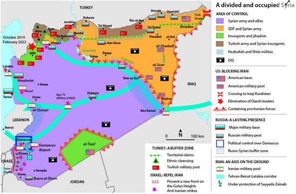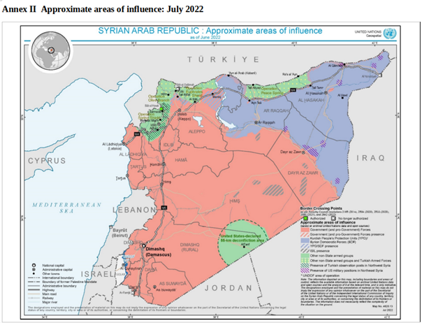 Mit Stand Dezember 2022 befinden sich die Gouvernorate al-Hassakah und Ar-Raqqa sowie Teile von Deir Ez-Zor nördlich des Flusses Euphrat und Teile des Gouvernements Aleppo um Manbij und Kobanê sowie das Gebiet um Tal Rifa'at unter der Kontrolle der kurdisch geführten SDF [Anm.: Syrian Democratic Forces - Syrische Demokratischen Kräfte der selbsternannten Selbstverwaltungsregion, auch Autonomous Administration of North and East Syria - AANES] (Liveuamap Stand 2.12.2022).