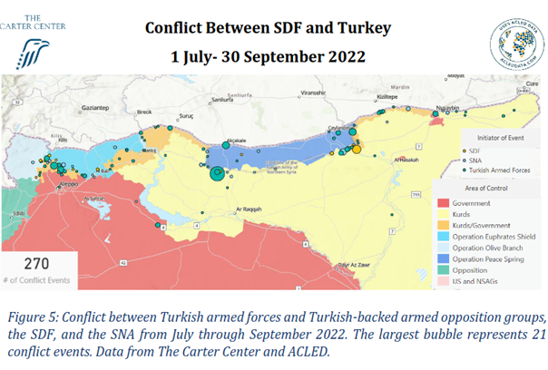 ACLED registrierte im dritten Quartal 2022 270 Konfliktfälle zwischen verschiedenen kurdischen bewaffneten Gruppen und türkischen Streitkräften oder von der Türkei unterstützten Oppositionsgruppen. Dies ist ein Rückgang um 30 % im Vergleich zum letzten Quartal. Der Rückgang erfolgte trotz der Rhetorik und der Besorgnis über einen neuen türkischen Einmarsch in Nordsyrien. Die Zahl der türkischen Drohnenangriffe ist weitgehend gleich geblieben (28 Ereignisse im zweiten Quartal und 29 im dritten Quartal). Die Angriffe beschränkten sich jedoch nicht mehr auf die Frontlinien, wo die überwiegende Mehrheit der Zusammenstöße und Beschussereignisse stattfinden; im Juli und August 2022 schlugen türkische Drohnen auf Ziele in den wichtigsten von den SDF kontrollierten städtischen Zentren und töteten Gegner (und Zivilisten) in Manbij, Kobani, Tell Abyad, Ar-Raqqa, Qamishli, Tell Tamer und al-Hassakah (CC 3.11.2022).