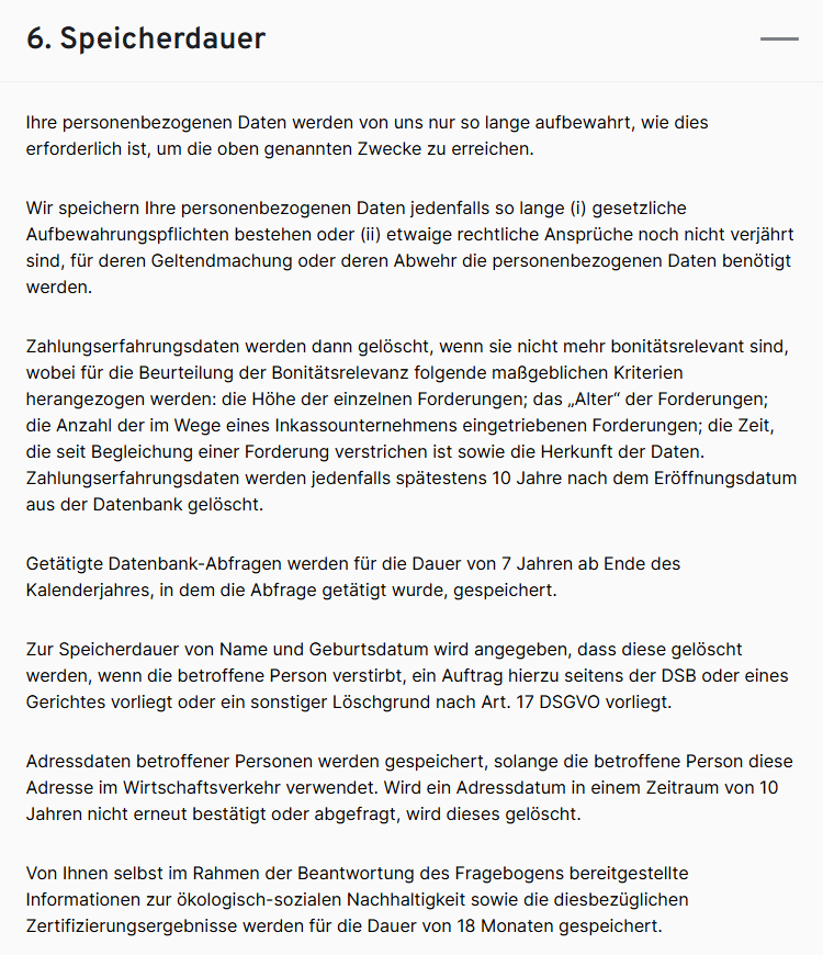 „Zahlungserfahrungsdaten über unbestrittene und nach Eintritt der Fälligkeit unbezahlte Forderungen sowie Adressdaten werden der XXXX , zur rechtmäßigen Verwendung im Rahmen ihrer Gewerbeberechtigungen gemäß 151 (Adressverlage), 152 (Auskunfteien über Kreditverhältnisse) und 153 (Dienstleistungen in der automatischen Datenverarbeitung und Informationstechnik) der Gewerbeordnung 1994 übermittelt. Detaillierte Informationen zur Datenverarbeitung durch angegebene Auskunftei i.S.d. Art 14 DSGVO finden Sie auf deren Webseite unter XXXX