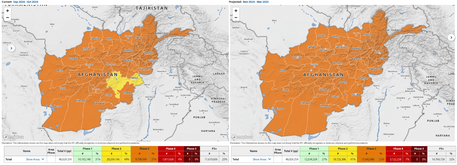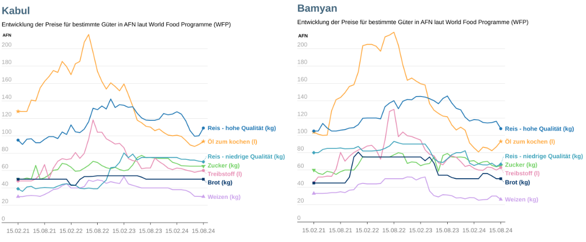 Die Versorgungslage in Afghanistan ist zum aktuellen Zeitpunkt nicht derart gestaltet, dass jeder Rückkehrer in eine seine Existenz bedrohende ausweglose Situation geraten würde, auch wenn sich die Lebensbedingungen äußerst schwierig gestalten. So verschlechterte sich die wirtschaftliche Lage nach der Machtübernahme der Taliban massiv, was unter anderem durch die Einstellung von internationalen Hilfsgeldern bedingt ist. Die humanitäre Lage bleibt weiterhin angespannt. Im Jahr 2024 benötigten etwa 23,7 Millionen Menschen (mehr als die Hälfte des Landes) humanitäre Hilfe aufgrund der Nachwirkungen von vierzig Jahren Krieg, der jüngsten politischen Umwälzungen und wirtschaftlicher Instabilität. Auch häufige Naturkatastrophen und der Klimawandel haben Auswirkungen auf die humanitäre Lage im Land. Die Inflation ging zwar zurück und ging im April 2023 in eine Deflation über, was in Verbindung mit günstigeren Wetterbedingungen für die Produktion von Nahrungsmitteln zu Preissenkungen bei Lebensmitteln führte. In weiterer Folge sank die akute Ernährungsunsicherheit in der Bevölkerung zwischen April und Oktober 2023 von 40 % auf 29 %. Die Wirtschaft stagnierte in weiterer Folge jedoch und die sozioökonomische Situation in Afghanistan ist weiterhin durch Armut, Ernährungsunsicherheit und Arbeitslosigkeit gekennzeichnet. In der Periode September bis Oktober 2024 sind nach Schätzungen der IPC ca. 11,6 Millionen Menschen (25 % der Gesamtbevölkerung) von einem hohen Maß an akuter Ernährungsunsicherheit betroffen, die in IPC-Phase 3 oder höher (Krise oder schlimmer) eingestuft wird. Davon befinden sich etwa 1,8 Millionen Menschen (4 % der Gesamtbevölkerung) in IPC-Phase 4 (Notfall) und etwa 9,8 Millionen Menschen (21 % der Gesamtbevölkerung) in IPC-Phase 3 (Krise). Diese leichte Verbesserung der Ernährungssicherheit ist auf eine verbesserte landwirtschaftliche Produktion, das Ausmaß der humanitären Nahrungsmittel- und landwirtschaftlichen Nothilfe im Zeitraum 2023/2024 und eine verbesserte Kaufkraft der Haushalte zurückzuführen. Für den Zeitraum November 2024 bis März 2025, der mit der kalten Jahreszeit zusammenfällt, prognostizierte IPC, dass 14,8 Millionen Menschen (32 % der Gesamtbevölkerung) in die IPC-Phase 3 oder höher (Krise oder schlimmer) eingestuft werden. Darunter fallen 3,1 Millionen Menschen (7 % der Gesamtbevölkerung) in Phase 4 und 11,6 Millionen (25 % der Gesamtbevölkerung) in Phase 3. Auch die Wohnkosten in Afghanistan sind – gemessen am Pro-Kopf-Einkommen – sehr hoch, gleichzeitig ist der Arbeitsmarkt stark angespannt.