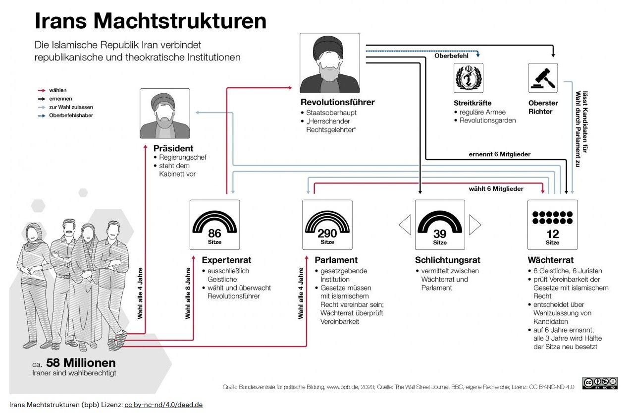 Iran ist seit 1979 eine Islamische Republik (FAZ 24.3.2023). Sie kombiniert republikanisch-demokratische Elemente mit einem theokratischen System, wobei die theokratischen Aspekte die republikanischen Prinzipien größtenteils überschatten und untergraben (BS 19.3.2024). Das Kernkonzept der Verfassung ist die "Rechtsgelehrtenherrschaft" (velayat-e faqih). Nach schiitischem Glauben gibt es einen verborgenen Zwölften Imam, den als Erlöser am Jüngsten Gericht von Gott gesandten Muhammad al-Mahdi (BPB 10.1.2020). Gemäß diesem Prinzip soll ein schiitischer Theologe praktisch in Stellvertretung des seit dem Jahr 874 im Verborgenen weilenden Mahdi agieren und die Geschicke des Gemeinwesens bis zu dessen Rückkehr lenken (BAMF 5.2022). Darauf aufbauend schuf Ayatollah Ruhollah Khomeini 1979 ein auf ihn zugeschnittenes Amt, das über allen gewählten Organen steht und somit die republikanischen Verfassungselemente des Präsidenten und des Parlaments neutralisiert: das Amt des "Herrschenden Rechtsgelehrten" (vali-ye faqih), dessen Inhaber auch "Revolutionsführer" (rahbar) (BPB 10.1.2020) oder Oberster Führer genannt wird (ÖB Teheran 11.2021). Die Macht liegt trotz der in der Islamischen Republik Iran abgehaltenen Wahlen nicht bei den gewählten Institutionen, sondern beim Obersten Führer und den ungewählten Institutionen unter seiner Kontrolle. Diese Institutionen spielen eine wichtige Rolle bei der Unterdrückung von abweichenden Meinungen und bei anderen Einschränkungen der bürgerlichen Freiheiten (FH 2025).