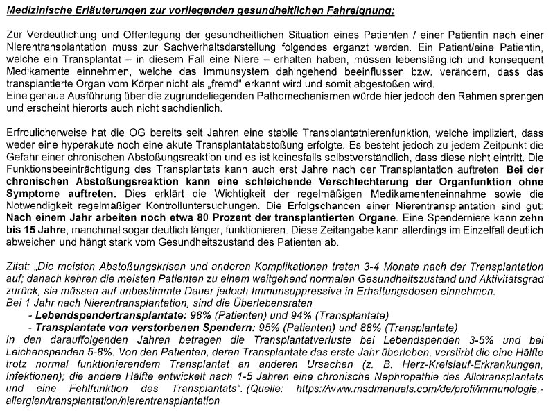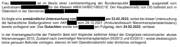 Beilage ./A: Ambulanzbericht des AKH xxx, gedruckt am 29.12.2021, über einen Ambulanzbesuch in der Nierentransplantambulanz am gleichen Tage mit folgendem Inhalt: „Frau xxx befindet sich seit 2013 in regelmäßiger Kontrolle in unserer Nierentransplantationsambulanz. Aus nephrologischer Sicht gibt es keine Kontraindikation für das Lenken eines Kraftfahrzeuges. Die Transplantat Nierenfunktion ist seit Jahren stabil und unverändert. Die Blutdruckwerte liegen im Zielbereich und sind stabil. Ein augenärztlicher Bericht liegt vor.“