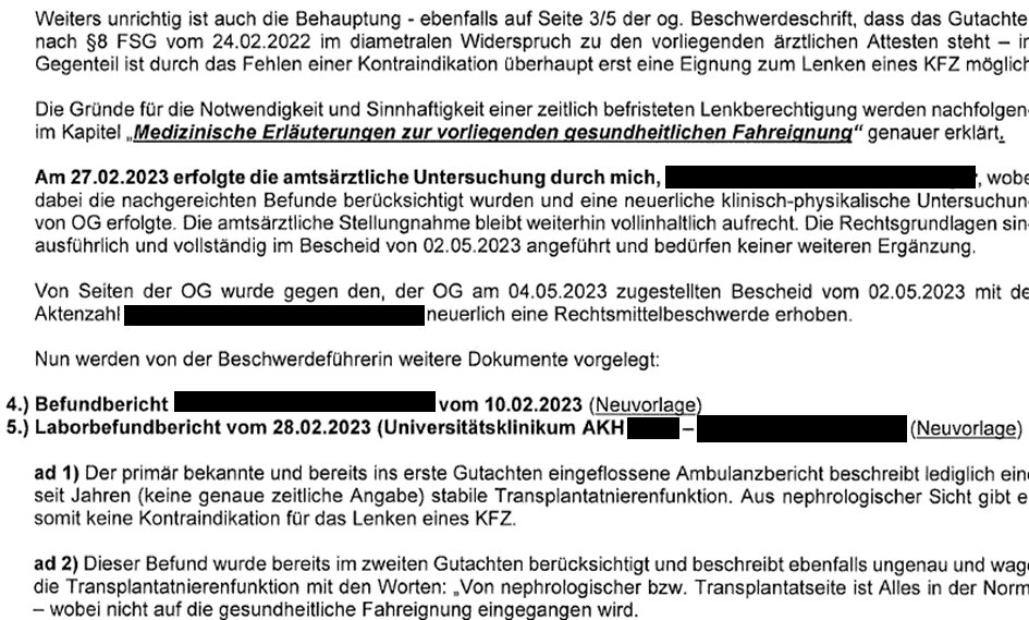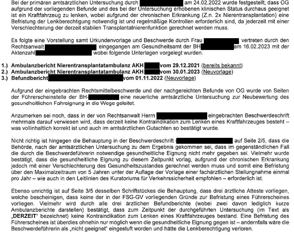 14. Am 28.8.2023 langte eine Stellungnahme samt Beweisanträgen ein. Zusammengefasst bringt die BF darin vor, dass der Sachverständige auf Basis der durchgeführten eigenen Untersuchungen aber auch aufgrund der vorliegenden Befundberichte zu dem Ergebnis komme, dass keine Kontraindikation zum Lenken eines Kraftfahrzeuges bei der BF bestehe und bestätige diesbezüglich der Amtssachverständige auch ausdrücklich und werde von ihm vollinhaltlich korrekt bescheinigt, „dass keine Kontraindikation zum Lenken eines Kraftfahrzeuges besteht“. Der Amtssachverständige lege weiters dar: „erfreulicherweise bereits seit Jahren eine stabile Transplantat Nierenfunktion, welche impliziert, dass weder eine hyperakute noch eine akute Transplantatabstoßung erfolge“.