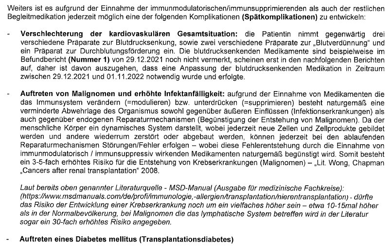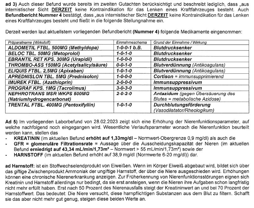 ASV: Wenn man über längere Zeit zu wenig trinkt, dann ist das für Transplantatinhaber gefährlich. Dazu kann man ergänzen, dass das Labor immer eine Momentaufnahme ist und in dem Fall natürlich von mehreren Faktor abhängt: wenn zu wenig getrunken wurde, ist das ein Grund, dass die Parameter ansteigen, durchaus. Meiner Meinung nach ist der eine Laborbefund vom 28.2.2023 irrelevant für das Verfahren. Die Werte sind aus der Norm. Es ist für das Verfahren generell irrelevant – das habe ich auch im Gutachten auf Seite 3 festgehalten. Weil man mehrere Befunde benötigt, um die Laborparameter als Verlaufsparameter zu beurteilen.