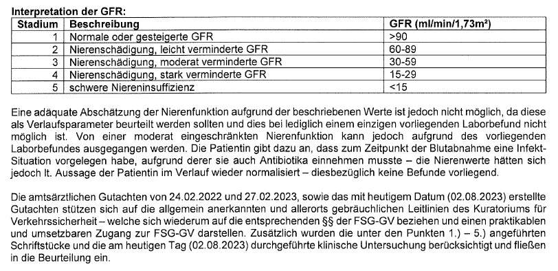 ASV: ebenfalls in meinem Gutachten vom 2.8.2023 auf Seite 3 von 5 ist das unter Punkt „Laborbefund“ bei Punkt 5 beschrieben. Da zeigt sich eindeutig eine Verschlechterung der Nierenfunktionsparameter.