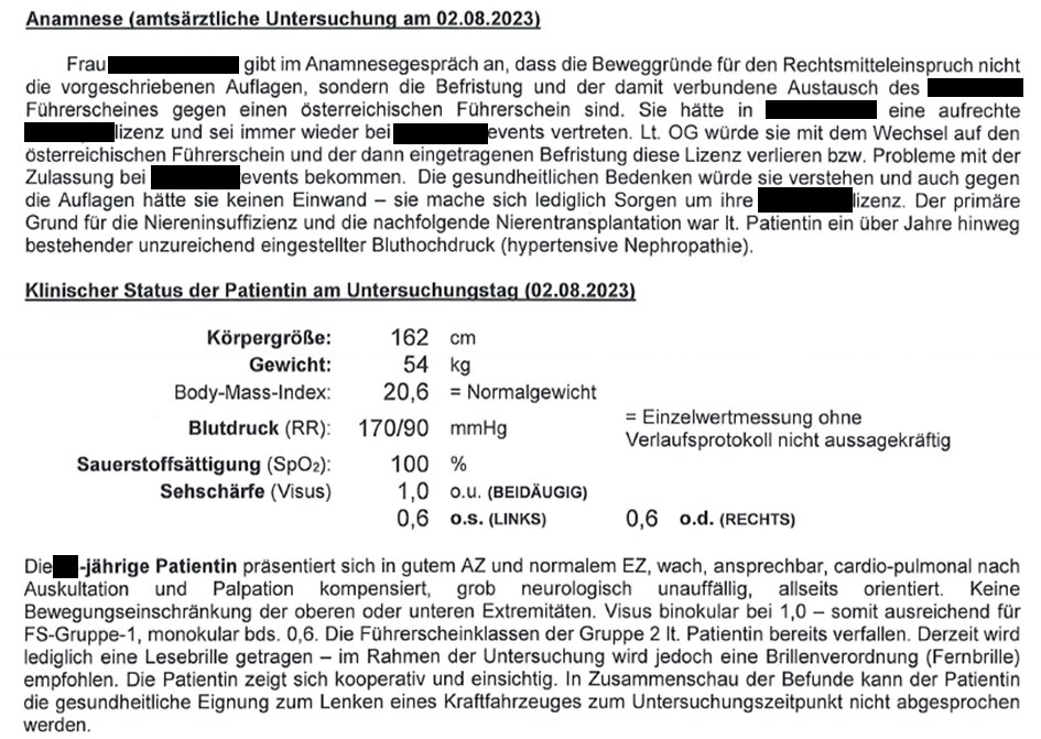 12. Der Amtsärztliche Stellungnahme xxx vom 2.8.2023, xxx, ging eine persönliche Untersuchung der BF am 2.8.2023 voraus, bei welcher die BF angab, in xxx eine aufrechte Rennsportlizenz zu besitzen, sich darum sorge, bei einer eingetragenen Befristung diese Lizenz zu verlieren und damit einhergehend zu xxxsportveranstaltungen nicht zugelassen werde. Die BF legte bei dieser Untersuchung am 2.8.2023 den Ambulanzbericht des AKH vom 30.1.2023 über einen Ambulanzbesuch in der Nierentransplantambulanz am gleichen Tage vor, wonach „von nephrologischer bzw Transplantseite alles in der Norm“ ist, sowie den Befundbericht des Facharztes für xxx xxx vom 14.2.2023, wonach die BF auf Zuweisung der Hausärztin vorstellig wurde (Beurteilung xxx: „Aus internistischer Sicht besteht derzeit keine Kontraindikation für das Lenken eines Kraftfahrzeuges“.)