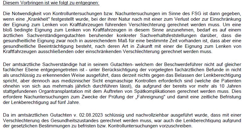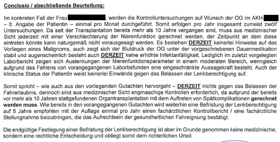 3.3.3. Die Festlegung einer Befristung der Lenkberechtigung und der Auflage von Kontrolluntersuchungen obliegt dem Gericht und werden vom gerichtlich beauftragten medizinischen ASV xxx im gerichtlich eingeholten Gutachten „engmaschige Kontrollen“ angeregt, da aufgrund der bereits vor mehr als 10 Jahren stattgefundenen Organtransplantation mit dem Auftreten von auf S. 4 im Gutachten näher beschriebenen Spätkomplikationen gerechnet werden muss.