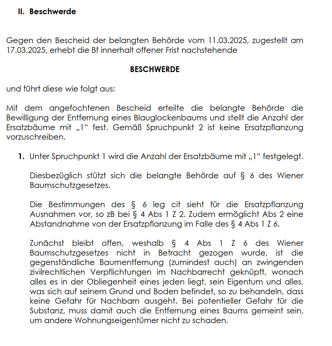 Mit Amtssachverständigengutachten vom 14.11.2024 wurde ausgeführt, dass die Voraussetzungen für eine Entfernung des Baumes gemäß § 4 Abs. 1 Z 3 Wr. BaumschutzG gegeben sind. Diesfalls sei die Ersatzpflanzung eines Baumes vorzuschreiben.