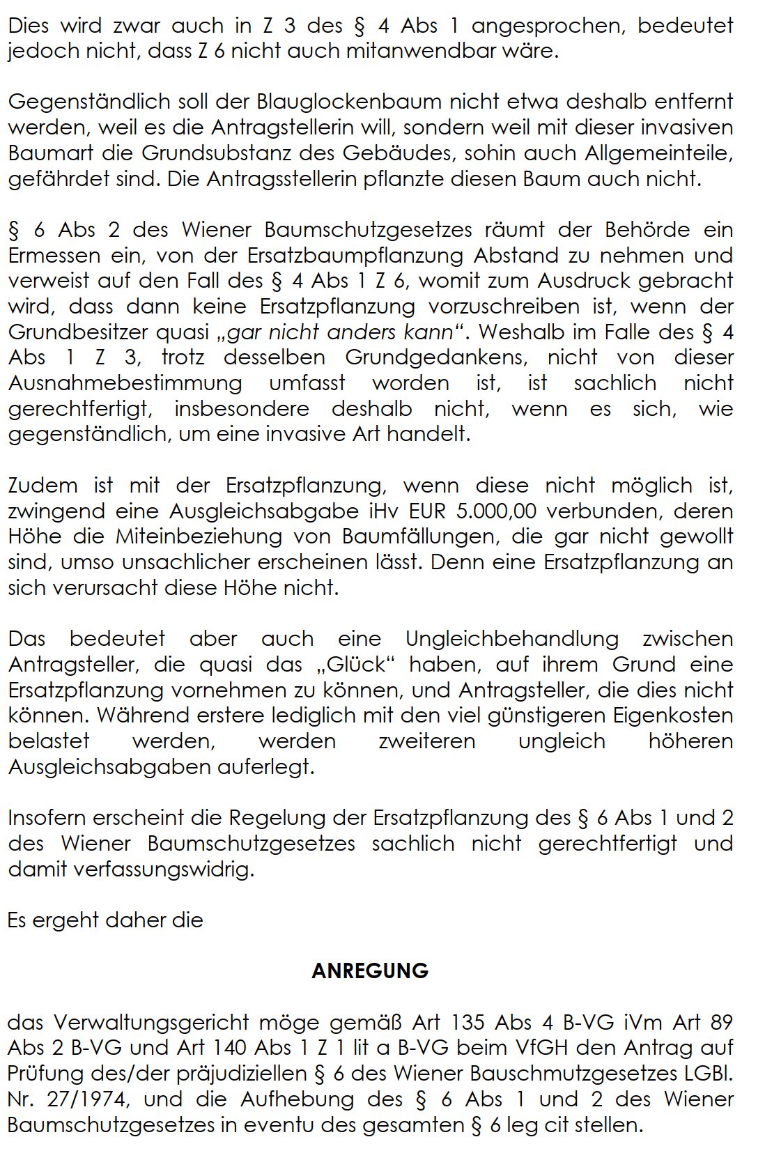 Zu diesem Vorbringen ist auszuführen, dass es keine gesetzliche Vorschrift gibt, welche einen Verfügungsberechtigten über einen Baum zur Entfernung dieses Baumes verpflichtet, wenn es sich bei diesem Baum um eine invasive Baumart handelt oder wenn dieser Baum potentiell einmal die Substanz eines (im Miteigentum stehenden) Gebäudes schädigt. Vielmehr ist insbesondere im Zusammenhang mit der Bestimmung des § 4 Abs. 1 Z 3 Wr. BaumschutzG der Bewilligungstatbestand des § 4 Abs. 1 Z 6 Wr. BaumschutzG dahingehend auszulegen, dass mit dieser Bestimmung das Vorliegen einer gesetzlichen Bestimmung, durch welche die Behörde zur Vorschreibung einer bestimmten Handlung bzw. zur Vorschreibung der Duldung einer bestimmten Handlung befugt wird, angesprochen. Wenn im Falle des Vorliegens eines solchen, die Behörde zur Vorschreibung eines bestimmten Handelns oder eines bestimmten Duldens befugenden Sachverhalts die Umsetzung des von der Behörde zu fordernden Erfolgs nur durch die Fällung eines Baumes erreicht zu werden vermag, ist vom Vorliegen des Bewilligungstatbestands des § 4 Abs. 1 Z 6 Wr. BaumschutzG auszugehen.