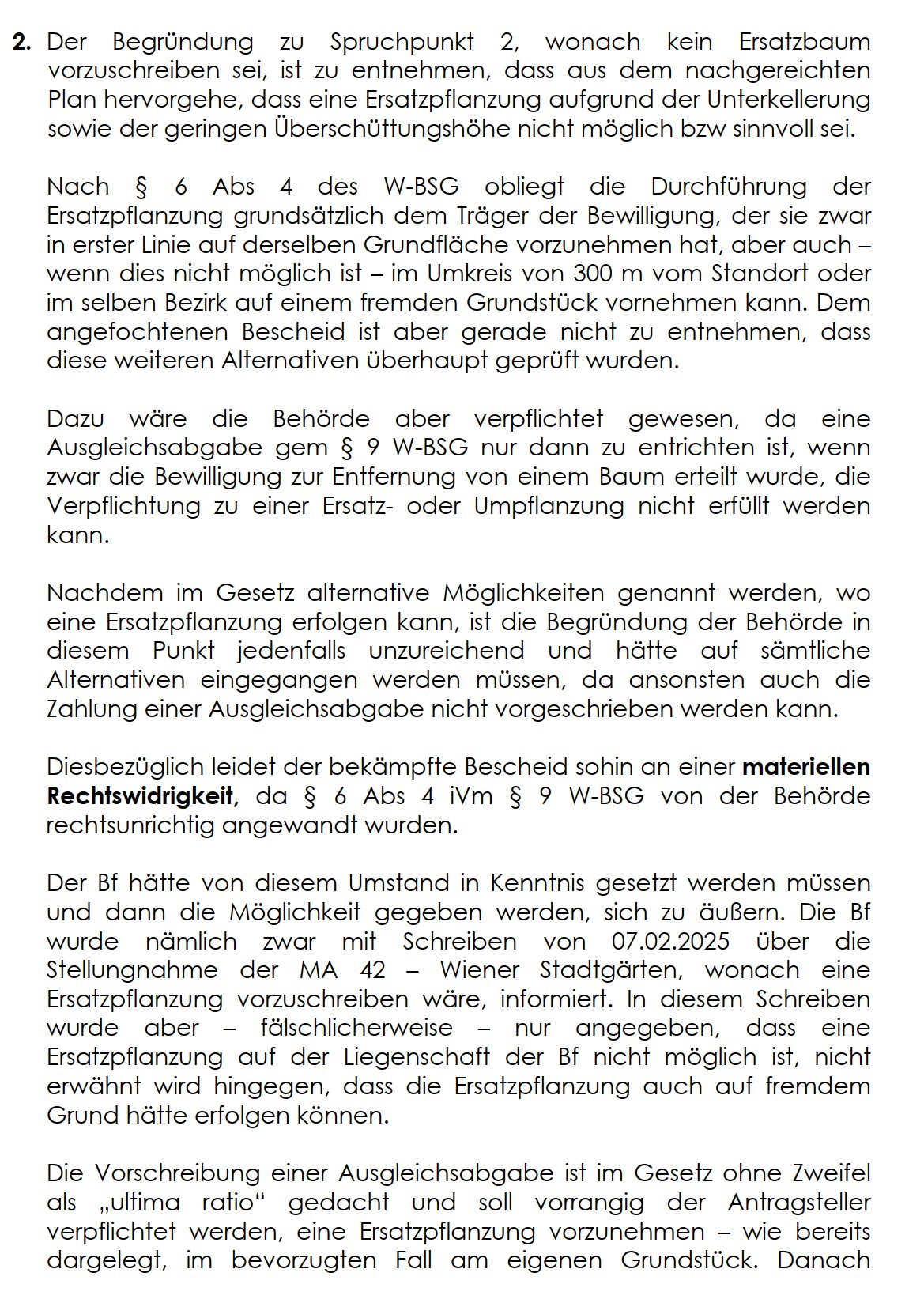 Mit Schriftsatz vom 6.2.2025 teilte die Magistratsabteilung 42 mit, dass infolge der Unterkellerung des gegenständlichen Grundstückteils und der daraus resultierenden geringen Überschüttungshöhe eine Ersatzpflanzung eines Baumes auf dem gegenständlichen Grundstück nicht möglich bzw. zumutbar ist.