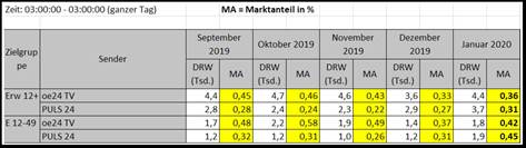 [4] Die Arbeitsgemeinschaft TELETEST publiziert die in ihrem Auftrag erhobenen Einschaltquoten im österreichischen Fernsehmarkt. Dabei werden die Marktanteile der TV-Sender ua für die Zielgruppen Erw 12+ (Personen älter als 12 Jahre) und E 12–49 (Personen von 12 bis 49 Jahren) ermittelt. Bei der Quotenmessung erfolgt jede Bezugnahme auf eine Zielgruppe jeweils mit Angabe des Alterskorridors. Die – hier relevanten – Marktanteile für die Monate September 2019 bis Jänner 2020 waren:
