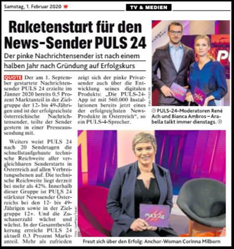 Der am 1. September 2019 gestartete Nachrichtensender PULS 24 erzielt im Jänner starke 0,5 Prozent (E 12–49) Marktanteil und ist somit schon jetzt der erfolgreichste österreichische Nachrichtensender. Bereits nach 20 Sendetagen weist PULS 24 die schnellst aufgebaute technische Reichweite aller vergleichbaren Senderstarts in Österreich auf allen Verbreitungsebenen auf (Kabel, Satellit und Terrestrik). Die technische Reichweite liegt derzeit bei mehr als 42 Prozent. Innerhalb dieser Gruppe ist PULS 24 stärkster Newssender Österreichs bei E 12–49 und E12+. In der Gesamtbevölkerung erreicht PULS 24 aktuell 0,3 Prozent Marktanteil.