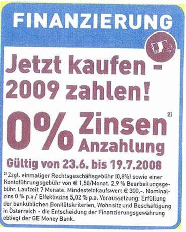 Der nach § 14 Abs 1 UWG klagelegitimierte Verein zur Wahrung von Verbraucherinteressen begehrte, der Beklagten aufzutragen, es im geschäftlichen Verkehr zu unterlassen, a) in ihrer Werbung, insbesondere in Werbeprospekten, ihren Kunden die Finanzierung des Kaufpreises über zinsenlose Kredite in Aussicht zu stellen ‑ hilfsweise b): den unrichtigen Eindruck zu erwecken, sie biete ihren Kunden die Finanzierung des Kaufpreises über zinsenlose Kredite an -, etwa durch die blickfangartig hervorgehobene Ankündigung „0 % Zinsen“, wenn die Inanspruchnahme des Kredits tatsächlich mit Entgelten, etwa Bearbeitungs‑ und Kontoführungsgebühren und damit mit einem Effektivzins von beispielsweise 3,9 % oder 5,02 % verbunden ist; der Kläger begehrte ferner, ihn zur Urteilsveröffentlichung zu ermächtigen. Die Ankündigung verstoße gegen Z 20 Anhang zum UWG, weil sie als Angebot der Vermittlung eines unverzinsten Darlehens, somit einer Dienstleistung zu verstehen und daher an diesem Tatbestand zu messen sei. Als unvermeidbare Kosten nach der genannten Bestimmung seien jedoch nur die staatlichen Rechtsgeschäftsgebühren anzusehen, nicht hingegen die Bearbeitungs- und Kontoführungsentgelte. Überdies sei die Ankündigung irreführend gemäß § 2 Abs 1 UWG. Dem Umworbenen werde ein besonderer Preisvorteil (§ 2 Abs 1 Z 4 UWG) vorgegaukelt, der aufklärende Hinweis auf die anfallenden Bearbeitungs‑ und Kontoführungsgebühren sei in den Prospekten kaum zu entziffern und im Online‑Katalog schlicht unleserlich. Das Versprechen einer zinsenfreien Kreditierung der Kaufpreisforderung sei geeignet, den Durchschnittsverbraucher einerseits zum Kauf eines Produkts und andererseits auch zur Inanspruchnahme eines Kredits zu bewegen, wovon er bei Kenntnis der wahren Umstände Abstand genommen hätte.