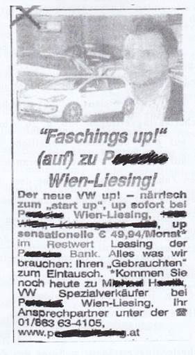 Die Erstbeklagte bewarb im Februar 2012 im Anzeigenteil der Tageszeitung „Kronen Zeitung“ den Abschluss von PKW‑Leasingverträgen mit nachfolgendem Inserat: