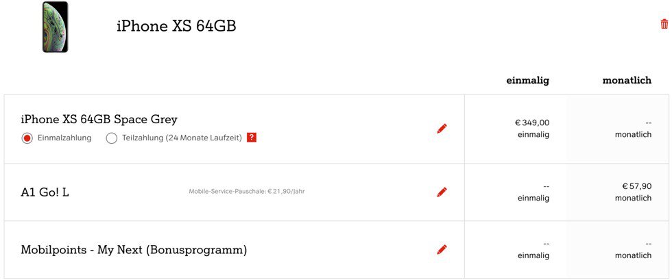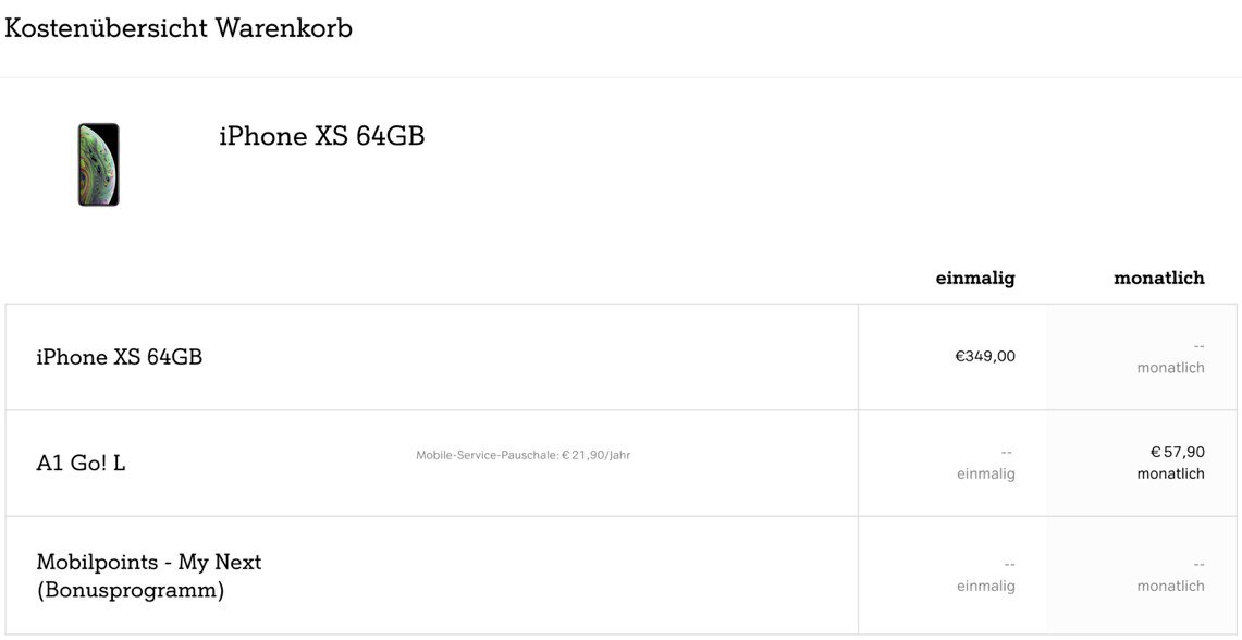 [3] Auf der Website der Beklagten https://www.a1.net (Stand: 28. 12. 2018) konnten Konsumenten unter dem Menüeintrag „Handys mit Vertrag“ insbesondere das „Apple iPhone XS 64 GB“ auswählen. Klickte der Konsument unter dem „Apple iPhone XS 64 GB“ auf den Button „Details“, wurden Kosten von „€ 57,90/Monat“ und der Gerätepreis von „einmalig € 349,00“ angezeigt. Diese Preise galten für den Kauf des Telefons bei gleichzeitigem Abschluss des Tarifs „A1 Go! L“ mit 24‑monatiger Vertragsbindung.