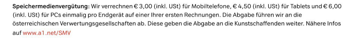 [9] Hier erwähnte die Beklagte erstmals eine „Speichermedienvergütung“ in Höhe von drei EUR für das gegenständliche Telefon. Die Beklagte verrechnete diese Kosten („Speichermedienvergütung“ und „Mobile‑Service‑Pauschale“) bei allen Kombinationsangeboten aus Mobiltelefon samt Tarif sowie auch bei allen selbständig angebotenen Mobiltelefonmodellen oder Tarifen zusätzlich zu den behaupteten Gesamtkosten. Sie verrechnete die Mobile-Service-Pauschale in Höhe von jährlich 21,90 EUR zB auch bei günstigeren Tarifen mit und ohne Telefonmodell (zB beim Tarif „A1 Easy-SIM S“ ohne Mindestvertragsdauer zum Preis von 17,90 EUR monatlich) und die Speichermedienvergütung in Höhe von drei EUR auch bei günstigeren Telefonmodellen mit und ohne Tarif (zB beim Telefonmodell Xiaomi Mi 8 zum Kombinations‑Preis von 0,00 EUR im Tarif „A1 Go! L“).
