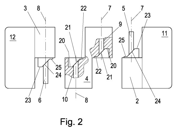 «Um den Verlust des Zusammenhalts zu vermeiden, ist dafür zu sorgen, dass in der Nullstellung trotz abgesenkten Zustand des Scharniers 1, die oben genannten Stirnflächen 23, 25 mit den Gegenstirnfläche 20, 22 nicht in Kontakt treten.»