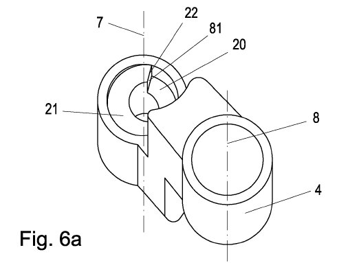 «Um den Zusammenhalt der Scharnierteile 2 und 3 und des Mittelteils 4 in einer oben genannten Nullstellung zu gewährleisten, kann entgegen der bereits beschriebenen Variante des Anschlages zwischen Mittelteil 4 und den Scharnierteilen 2, 3, eine weitere Ausgestaltung vorgesehen sein.»