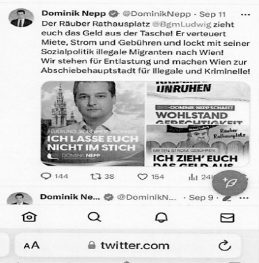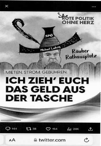 Es folgen Fenster mit dem Titel „Fernwärmepreise verdoppelt“, „Gebührenwahnsinn stoppen“, „Mietwucher im Gemeindebau“ und „Gas und Strompreise explodieren“, die, wenn man die in diesen Fenstern angebrachte Abspielzeile drückt, neuerlich eine mit dem erwähnten Hut versehene Darstellung eines Mannes hinter einem Zaun zeigen, wobei in diesem Hut die Worte „SPÖ“ und „Michael Ludwig“ eingefügt sind.