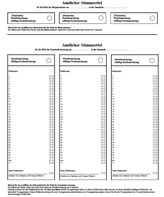 In allen anderen Bundesländern hat sich bewährt, dass für jede Wahl (Wahl zum Bürgermeister und in die Gemeindevertretung[)] je ein gesonderter Stimmzettel verwendet wurde.