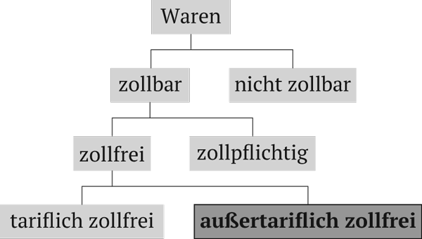Zollbare Waren (s Kapitel B.I.) können zollpflichtig oder zollfrei sein. Zollfreiheit kann sich entweder aus dem Zolltarif (Nullzollsatz, s Kapitel D.I.3.b.) oder aus anderen Gründen (sog außertarifliche Zollfreiheit) ergeben.