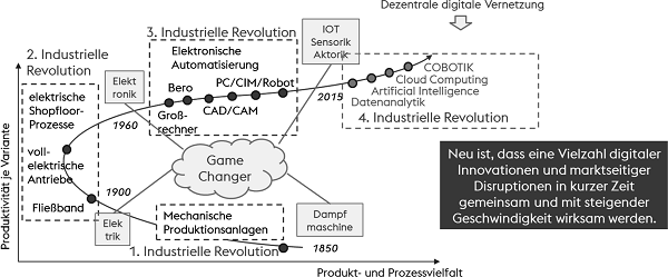 Auslösende Elemente für gravierende Veränderungen im Marktumfeld waren immer sog „Game Changer“-Technologien, welche vollkommen neue Lösungsansätze für einen sich entwickelnden Kundenbedarf ermöglichten. Die Wechselwirkung von steigender Kundenerwartung und Innovationspotential auf der technologischen Angebotsseite sind die Inkubatoren für disruptive „Game Changer“ wie Internet of Things, COBOTIC (Kollaborative Roboter, die für die direkte Interaktion mit dem Menschen konzipiert sind) oder Artificial Intelligence als Auslöser einer 4. Industriellen Revolution.