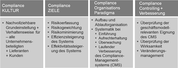Die Verankerung von Compliance im Geschäftsmodell basiert inhaltlich auf vier Säulen (I).