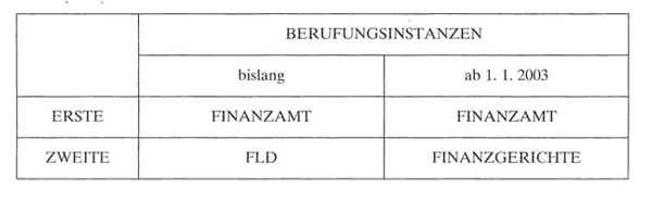 Was das Berufungsrecht betrifft, ist zu betonen, dass es zum 1. 1. 2003 zu einer gravierenden Veränderung kommt. An die Stelle der als 2. Instanz fungierenden Finanzlandesdirektionen (FLD) treten nunmehr sog. unabhängige Finanzgerichte.