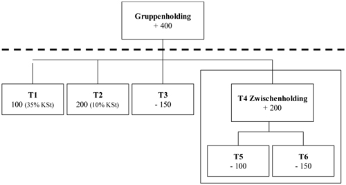 Im Folgenden sollen anhand eines konkreten Beispiels die Vorteilhaftigkeit und gegebenenfalls die Schwachstellen der einzelnen Gruppenbesteuerungssysteme aufgezeigt werden. Gegeben ist der folgende Konzernaufbau mit entsprechenden Gewinnen und Verlusten:Die inländische Muttergesellschaft ist zu 100 % (Kapital und Stimmrechte) an den zugehörigen ausländischen Tochtergesellschaften beteiligt. Die Tochtergesellschaft T1 wird im Ausland mit einem Steuersatz iHv 35 % besteuert, während T2 mit Sitz in einem Niedrigsteuerland nur einer 10%igen KSt-Belastung unterliegt. Ansonsten wird für jede Gesellschaft eine Körperschaftsteuer iHv 30 % angenommen. Die Gesellschaften T4, T5 und T6 haben ihren Sitz und Geschäftsleitung im selben Staat und nutzen dort die Möglichkeit einer nationalen Gruppenbesteuerung.