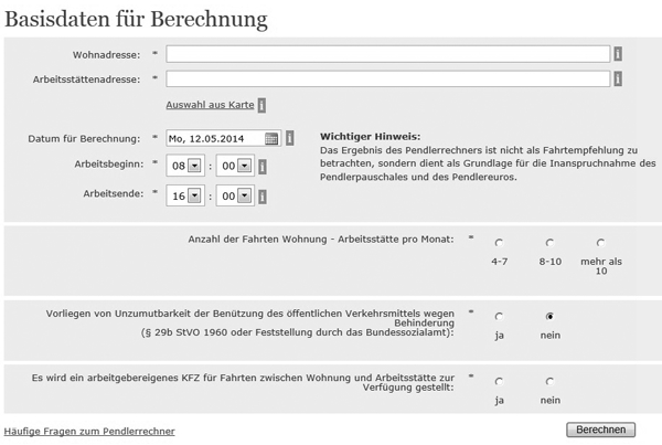 Der Pendlerrechner dient zur Ermittlung der Entfernung zwischen Wohnung und Arbeitsstätte und zur Beurteilung, ob die Benützung eines Massenbeförderungsmittels (öffentliches Verkehrsmittel) zumutbar oder unzumutbar ist. Basierend auf diesen Ergebnissen wird die Höhe eines etwaig zustehenden Pendlerpauschales und Pendlereuro ermittelt.