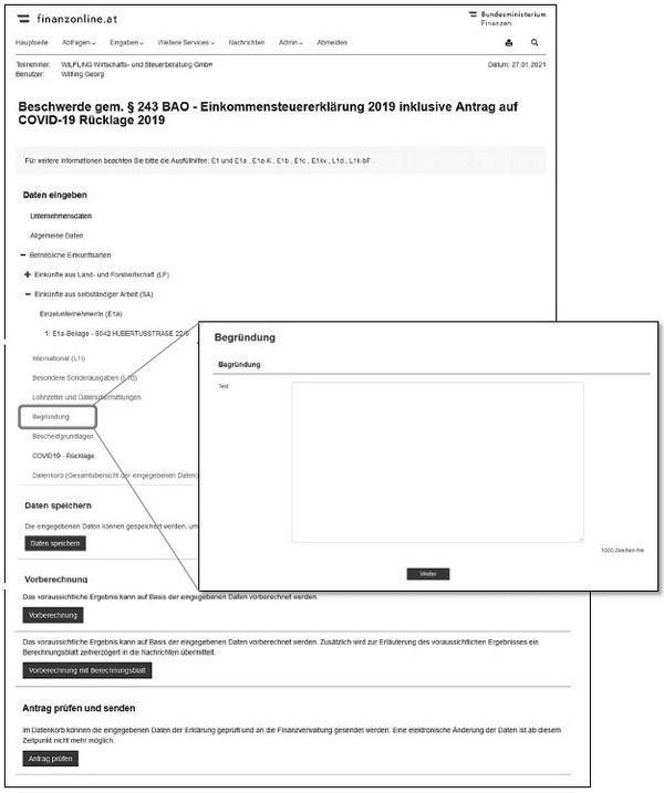 Die Eingabemaske für eine Beschwerde gegen etwa einen Einkommensteuerbescheid in FinanzOnline bietet die Möglichkeit, die relevanten Kennzahlen der eingereichten Steuererklärung direkt „auszubessern“. Sie unterscheidet sich von der ursprünglichen Erklärung durch den Zusatzmenüpunkt „Begründung“.
