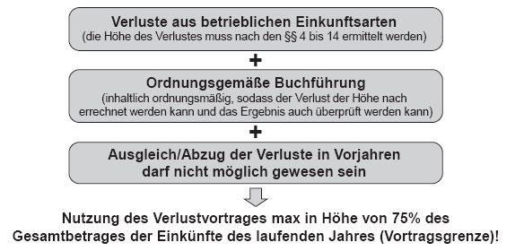 Begrenzung des Verlustvortrages: Vortragsfähige Verluste aus Vorjahren können nur im Ausmaß von 75 % des Gesamtbetrages der Einkünfte abgezogen werden (Vortragsgrenze; § 8 Abs 4 Z 2 lit a KStG); es müssen daher mindestens 25 % der positiven Einkünfte für die Besteuerung übrigbleiben.
