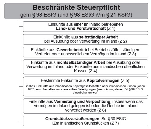 Neben der unbeschränkten Steuerpflicht (Wohnsitz, Sitz, gewöhnlicher Aufenthalt in Österreich; siehe oben), kann sich ein inländischer Besteuerungsanspruch auch aufgrund des Vorliegens von beschränkter Steuerpflicht in folgenden Fällen ergeben: