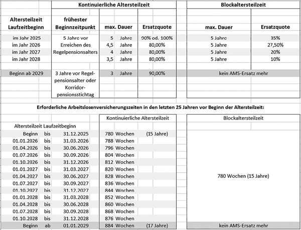 Die für die Altersteilzeit, das Regelpensionsalter, das Korridorpensionsalter maßgeblichen Übergangsstufen sind in der folgenden Tabellensammlung übersichtlich zusammengefasst (siehe auf der nächsten Seite):