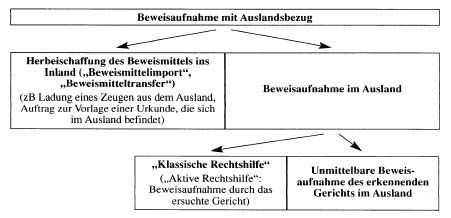Befinden sich Beweismittel, die in einem gerichtlichen Verfahren aufgenommen werden sollen, im Ausland, kommen folgende Möglichkeiten in Betracht:Ob ein Beweis mit Auslandsbezug aufzunehmen ist (sprich ob die Beweisaufnahme erforderlich und zulässig ist) liegt in der Entscheidungsbefugnis des nationalen Richters, der dafür sein nationales Verfahrensrecht anzuwenden hat.1 Es liegt auch in seiner Entscheidungsbefugnis, für welche der möglichen Methoden er sich entscheidet.2 Das ist eine Frage der unabhängigen Rechtsprechung.