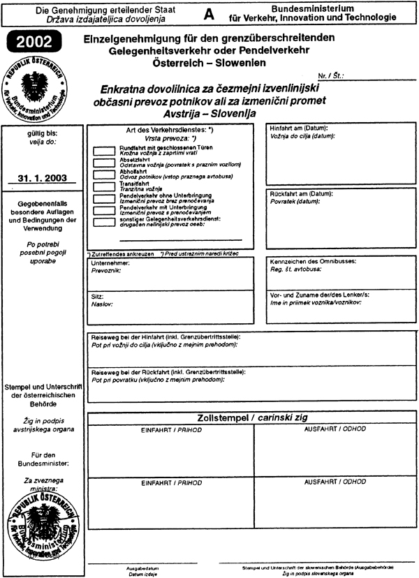 Die vorliegende Genehmigung befreit nicht von der Einhaltung der gesetzlichen Vorschriften, die in der Republik Österreich auf dem Gebiet des Gelegenheitsverkehrs Anwendung finden.