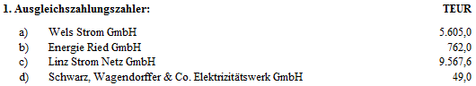 (7) Für den Netzbereich Linz werden folgende Ausgleichszahlungen festgelegt, wobei die Abwicklung der Zahlungen durch die Linz Strom Netz GmbH zu erfolgen hat: