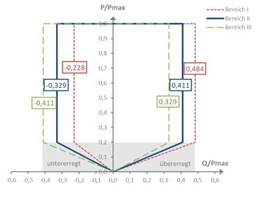 (3) Im übererregten Bereich ist eine Reduzierung der Wirkleistung zugunsten der Blindleistungsbereitstellung zulässig. In diesem Fall ist in Abstimmung mit dem relevanten Netzbetreiber unter Berücksichtigung der technischen Eigenschaften der Stromerzeugungsanlage und der Erfordernisse des Netzbetreibers die Reduktion der Wirkleistung zur vollständigen Erfüllung der Blindleistungsanforderungen so gering wie möglich zu halten und darf jedenfalls 10% der Maximalkapazität (Pmax) am Übergabepunkt nicht überschreiten.