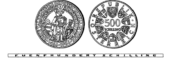 (2) Die andere Seite hat in der Mitte die Zahl „500“, darunter das Wort „SCHILLING“, ferner in kreisförmiger Reihung das Bundeswappen und die Wappen der neun Bundesländer sowie die Umschrift „REPUBLIK ÖSTERREICH“ zu tragen.