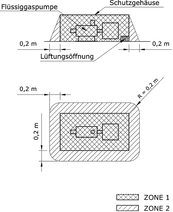 Explosionsgefährdeter Bereich für Flüssiggaspumpen im Freien mit geringer Förderleistung (bis 60 l/min), mit Schutzgehäuse und ohne Flüssiggaswarneinrichtung