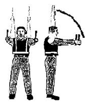 (Beide Arme sind – vor dem Körper gekreuzt – schräg nach untern ausgestreckt.)