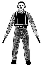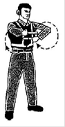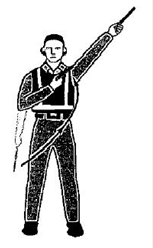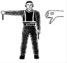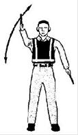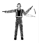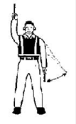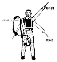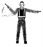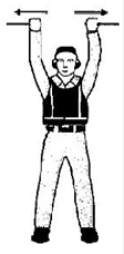 (Die abwärts gerichteten Arme zeigen mit den Handflächen zum Boden, dann wird eine Hand wiederholt aufwärts und abwärts bewegt, die andere Hand bleibt in Ruhestellung. Wird die linke Hand bewegt, ist das Triebwerk – beziehungsweise sind die Triebwerke – rechts zu drosseln; wird die rechte Hand bewegt, ist das Triebwerk – beziehungsweise sind die Triebwerke – links zu drosseln.)